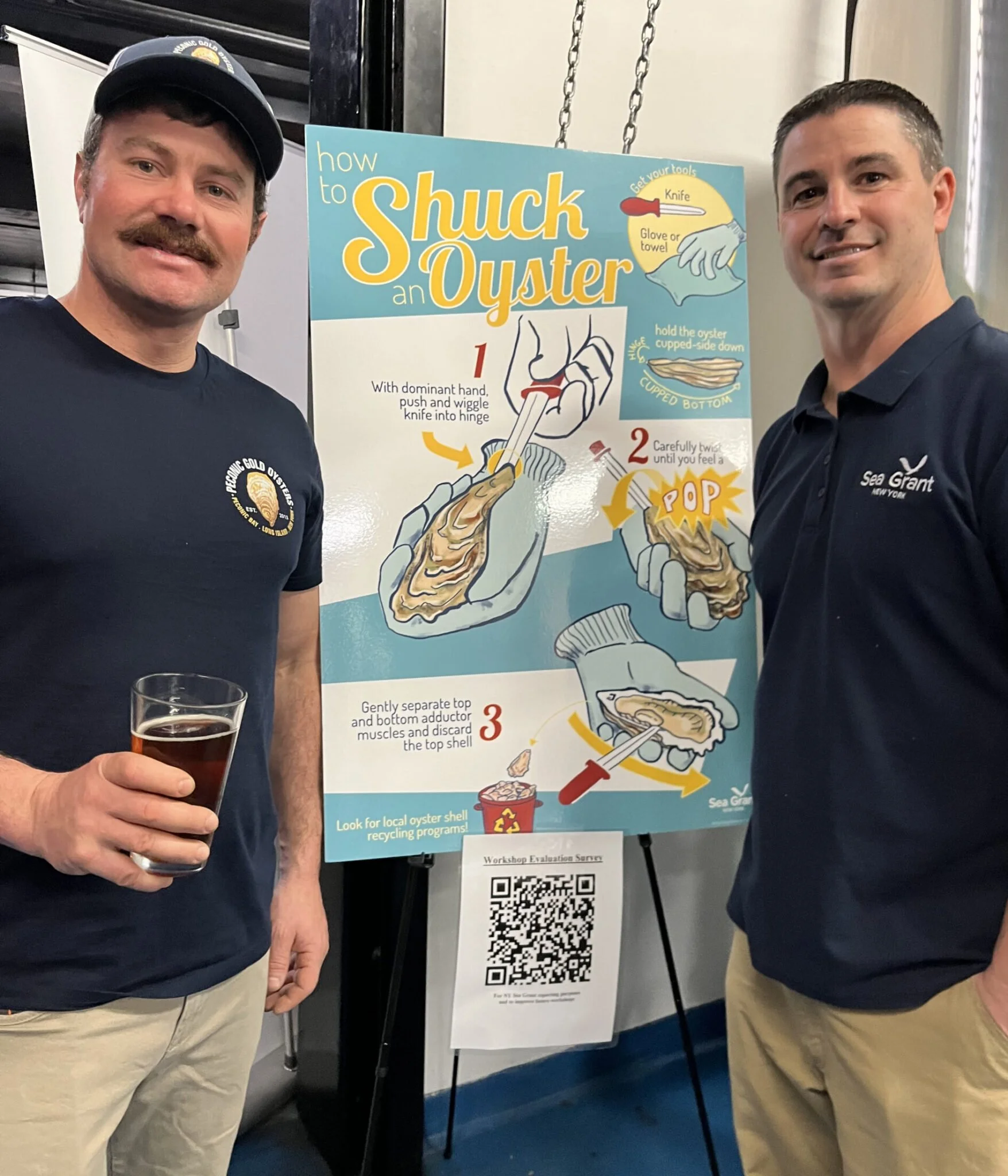 Led by Barry Udelson, Aquaculture Specialist at New York Sea Grant, the workshop paired an oyster farmer — in this case, Matt Ketcham of Peconic Gold Oysters — at a local brewery, North Fork Brewing Company on East 2nd St. in Riverhead.